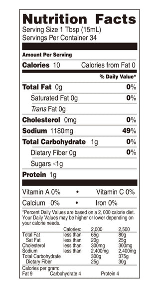 Water, Soybeans, Salt, Wheat Flour, Monosodium L-glutamate, Sugar, Disodium 5’guanylate & Disodium 5’-inosinate, & Potassium Sorbate ( Less than 1/10 of 1% as food preservative).